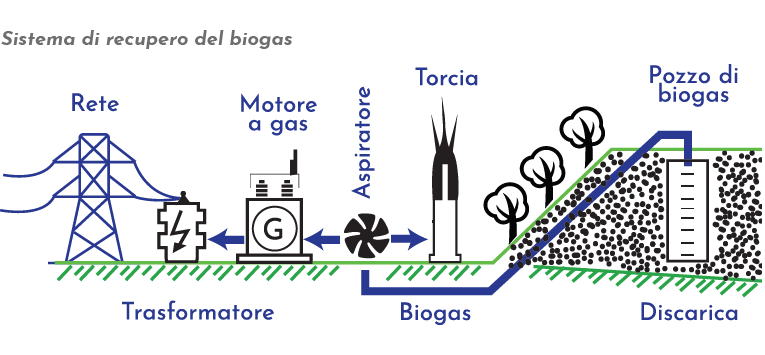 Il sistema di captazione e recupero del biogas garantisce la continua tenuta in depressione della discarica. Il sistema consente di evitare emissioni diffuse e incontrollate in atmosfera di gas a effetto serra (metano) nonché – attraverso un motore a combustione interna a biogas – di valorizzare energeticamente una fonte rinnovabile. Per ogni mc di biogas estratto si producono in media 1.6 kWh/h di energia elettrica, poi ceduta alla rete elettrica nazionale Enel.