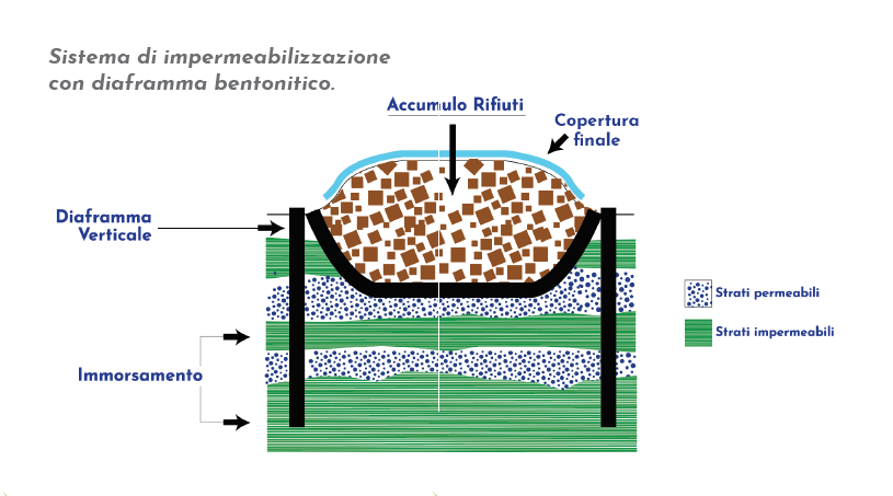 Le prestazioni impermeabili sono inoltre rafforzate dalla posa di una geomembrana in HDPE e da una seconda barriera costituita da un diaframma perimetrale verticale, realizzato con bentonite granulare immorsato su un livello argilloso naturale di fondo che garantisce l’assoluta separazione idraulica dal terreno.