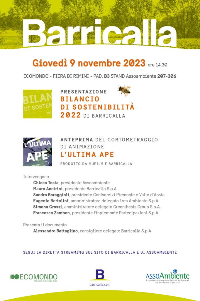 Giovedì 9 novembre, Barricalla ha presentato presso lo stand di Assoambiente il proprio bilancio di sostenibilità per l’anno 2022, momento durante il quale è intervenuta anche Simona Grossi in veste di consigliere della società. In tale occasione è stato presentato al pubblico per la prima volta “L’ULTIMA APE”, il cortometraggio prodotto da Mufilm e Barricalla che racconta la vita di un’ape che scappa dalla città inquinata nella quale rischia di morire e si rifugia in un ecosistema favorevole, la discarica di Barricalla. Un’altra proiezione avverrà lunedì 15 gennaio 2024 presso il teatro Lavanderia a Vapore, Corso Pastregno 51, Collegno (TO), ore 18:00.