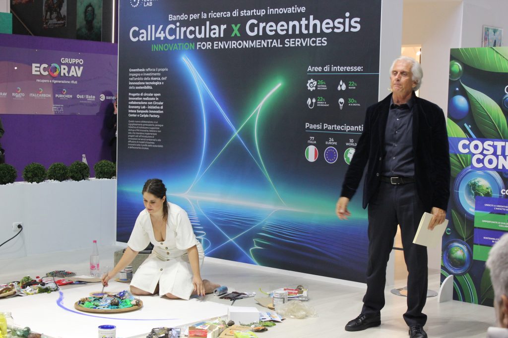 Per dare risalto a questa iniziativa, il pomeriggio del 6 novembre si è svolta una performance artistica unica, che ha visto la partecipazione di Massimiliano Finazzer Flory e Giovanna Zampagni. La performance ha dato vita ai pensieri di giovani studenti sulla Green Economy, trasformando materiali di scarto in opere d’arte e utilizzando parole evocative di un futuro sostenibile. Questo evento, arricchito dal sound design originale di Matteo Pendenza, si è inserito perfettamente nella cornice di Ecomondo come un’esperienza interattiva che ha invitato il pubblico a riflettere e a partecipare attivamente.