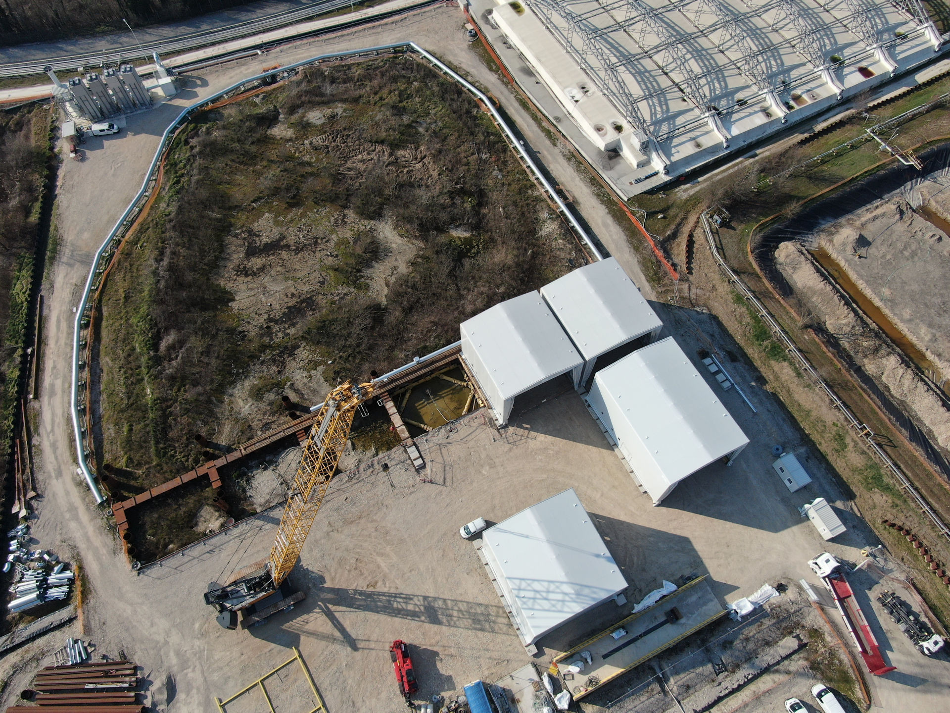 Le celle di scavo, realizzate con pareti combinate composte da palancole e tubi, sono state progettate per essere ridimensionate in funzione di eventuali criticità che si dovessero riscontare in corso d’opera; le tendostrutture che le confinano sono sollevabili e movimentabili senza necessità di essere continuamente smontate e rimontate.