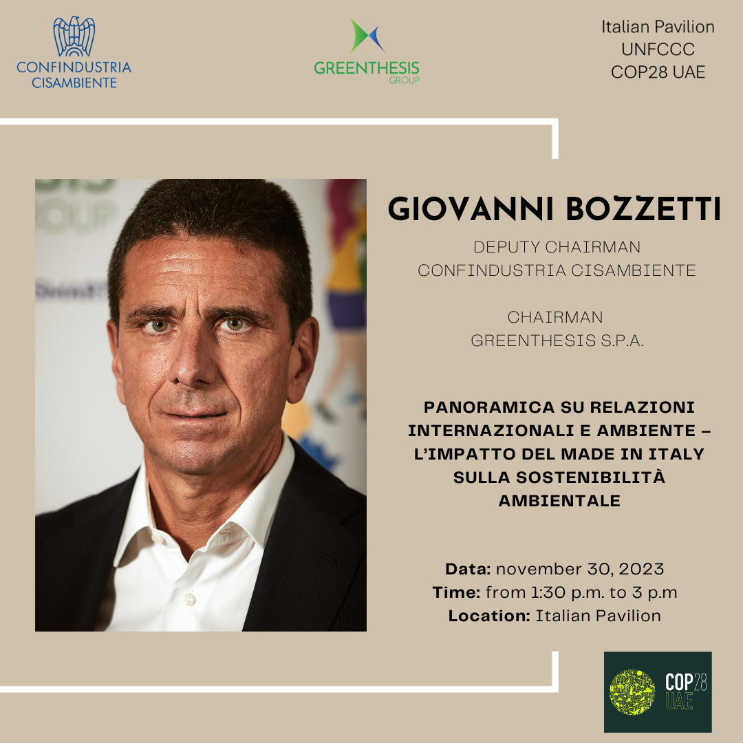 E’ un grande onore – spiega Giovanni Bozzettiper Greenthesis e Confindustria Cisambiente essere presenti nella giornata inaugurale perché rappresenta il riconoscimento della leadership che l’Italia ha nella sostenibilità ambientale e nell’economia circolare. […] Posso dire senza dubbio che accanto ai settori più conosciuti del made in Italy abbiamo il made in Italy della sostenibilità e il made in Italy dell’economia circolare”.