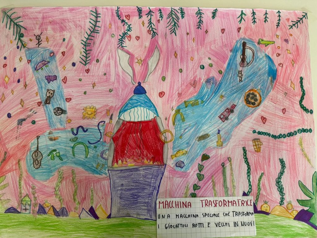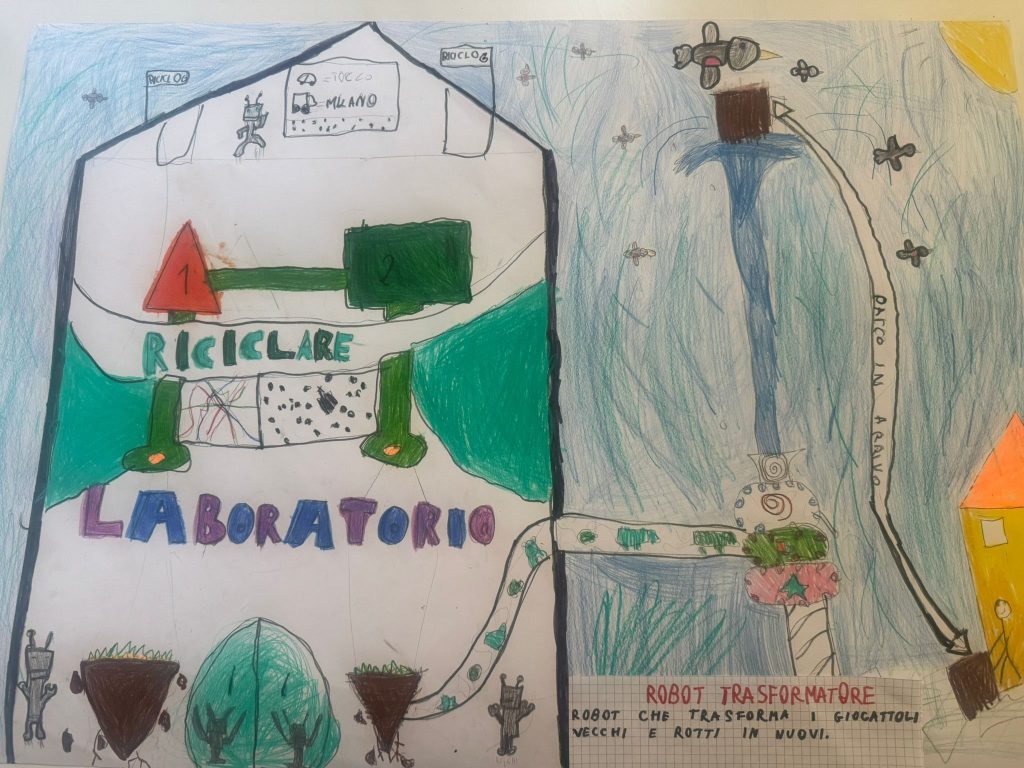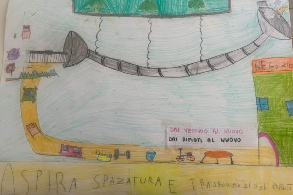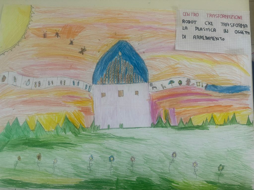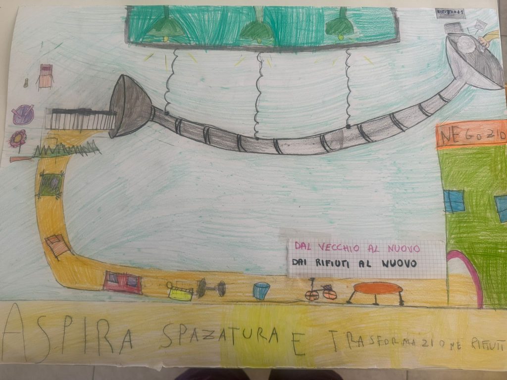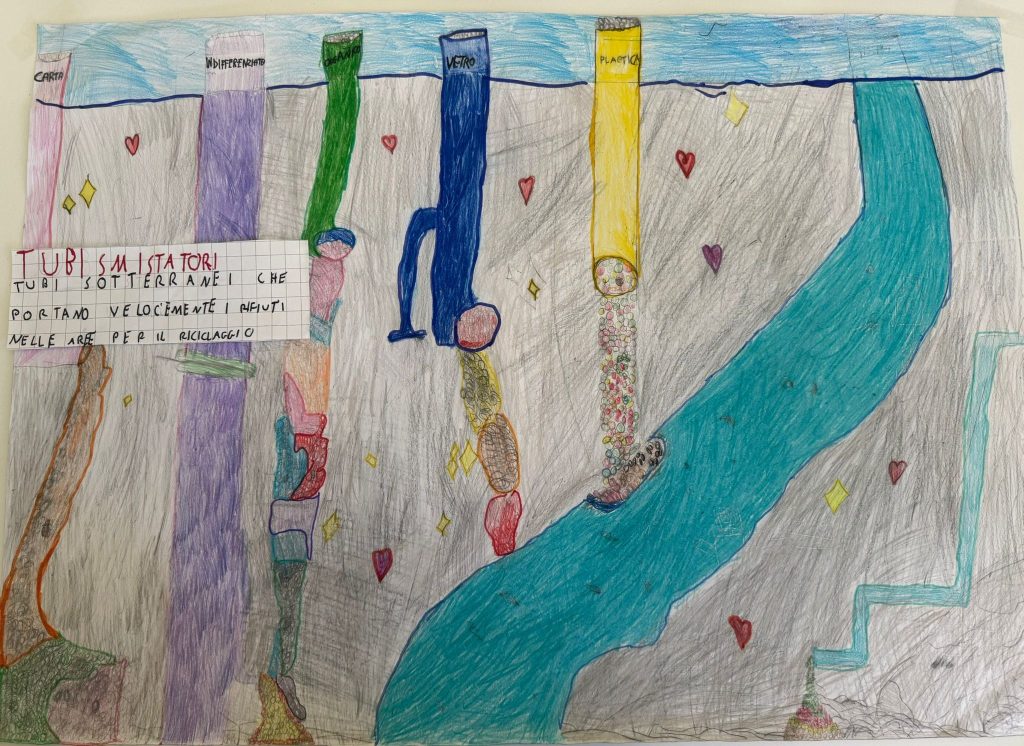 Con matite e colori, gli alunni hanno immaginato il futuro del riciclo e delle tecnologie ambientali. Disegni visionari raccontano impianti di smaltimento avveniristici e processi innovativi, frutto di un lavoro collettivo che unisce fantasia e consapevolezza ecologica.